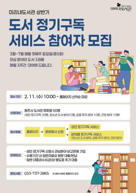 모집 대상은 원주시 도서관 정회원이며, 성인 정기구독 서비스 20명과 분야별(청소년, 금융·투자, 건강) 정기구독 서비스 각 10명씩 총 50명을 모집한다.