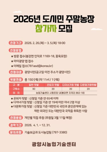 (포탈뉴스통신) 광양시는 도심 속에서 농업을 체험하며 가족과 함께 건강한 여가를 보낼 수 있는 ‘2026년 도시민 주말농장’ 참가자를 2월 26일부터 3월 5일까지 모집한다고 밝혔다.