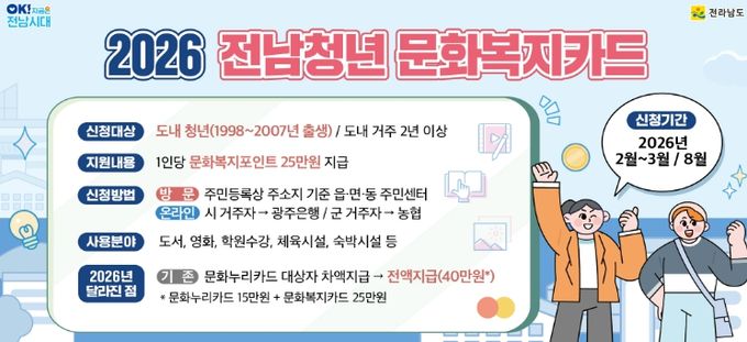 전남 청년 문화복지카드는 지역 청년에게 문화 활동비를 지원해 문화생활과 자기계발 기회를 제공하는 사업으로, 대상자 1인당 연 25만 원의 문화복지 포인트를 지급한다.
