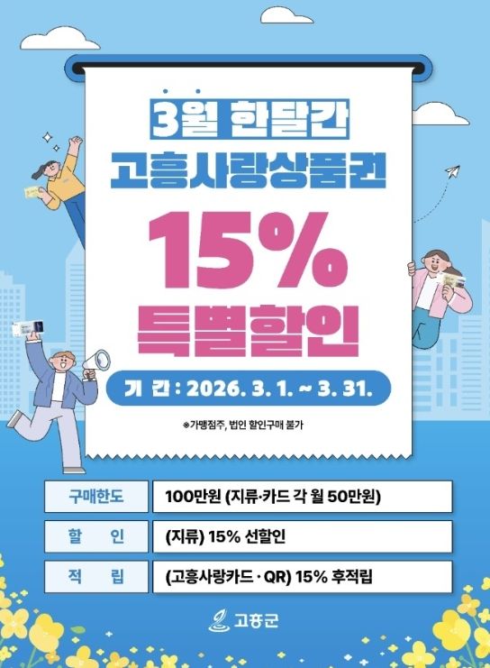 (포탈뉴스통신) 고흥군은 오는 3월 1일부터 한 달간 민생경제 회복에 박차를 가하기 위해 고흥사랑상품권 15% 특별할인을 지속 추진한다고 밝혔다.