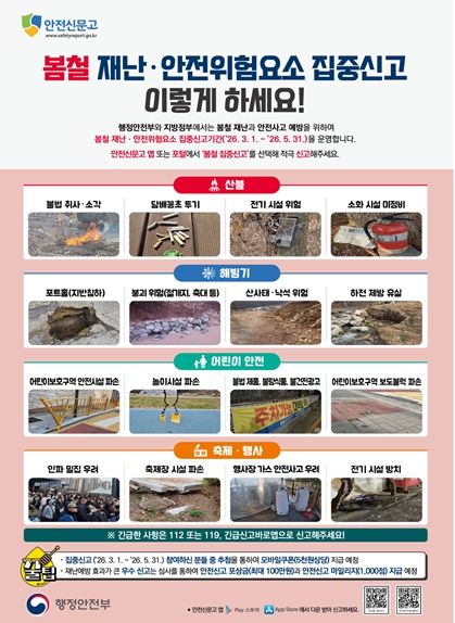 봄철 집중신고 대상은 ▲산불 ▲해빙기 ▲어린이 안전 ▲축제·행사 등 봄철에 위험 발생 가능성이 높은 4개 분야다.
