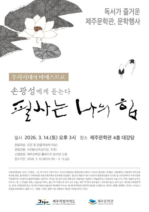 강연은 도민 등 150여 명을 대상으로 무료로 진행된다. 사전 신청은 10일부터 13일까지 제주문학관 누리집 교육·프로그램 신청 메뉴에서 할 수 있다.