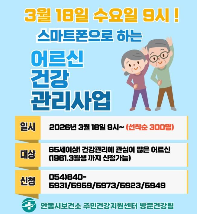 안동시 관계자는 “스마트 기기와 앱을 활용한 건강관리 서비스를 통해 어르신들이 스스로 만성질환을 관리하고 건강한 생활습관을 형성하는 데 도움이 될 것으로 기대한다”며 “많은 관심과 참여를 바란다”고 전했다.
