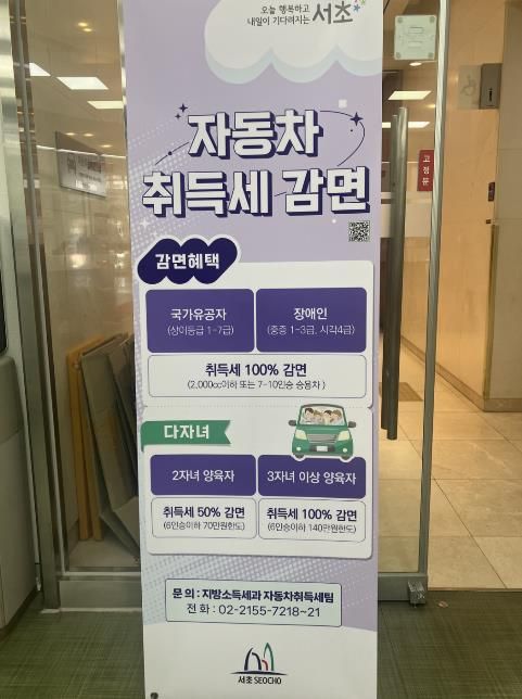 (포탈뉴스통신) 서울 서초구가 차량취득세 감면 대상자의 알권리를 강화하고 납세자의 불이익을 사전에 막기 위해 구청 1층 자동차등록 민원실 입구에 '차량취득세 감면 홍보 배너'를 설치하고 안내에 나선다고 밝혔다.