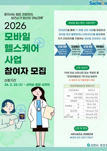 (포탈뉴스통신) 사천시보건소가 시민들의 건강한 생활 습관 형성을 돕기 위해 오는 4월 10일까지 ‘2026년 모바일 헬스케어 사업’ 참여자 100명을 선착순으로 모집한다.
