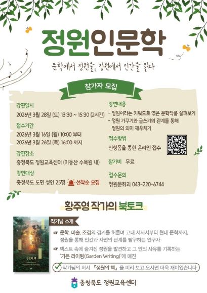 이번 교육은 3월 28일, 조경학 박사이자 ‘정원의 책 (한겨레출판, 2025)’ 저자인 황주영 작가를 초빙해 문학과 정원의 관계를 알아보는 ‘인문학으로 읽는 정원’과 정원을 하나의 예술로 감상하는 ‘책 밖으로 나온 정원’을 주제로 북토크 형식으로 진행된다.