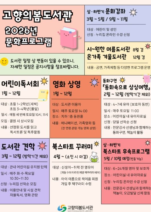자세한 사항은 도향의봄도서관 누리집의 공지사항을 참고하거나 고향의봄도서관팀으로 문의하면 된다.