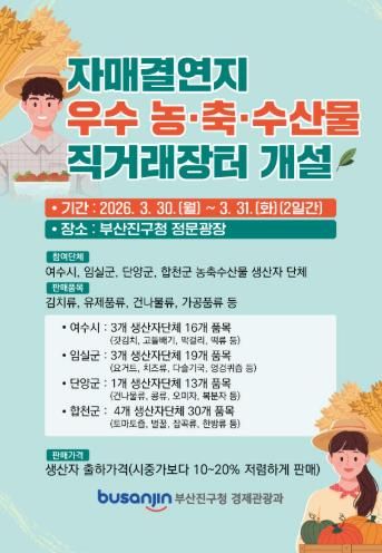 (포탈뉴스통신) 부산진구는 3월 30일부터 31일까지 부산진구 정문광장에서 ‘자매결연지 농축수산물 직거래장터’를 개최한다고 밝혔다.