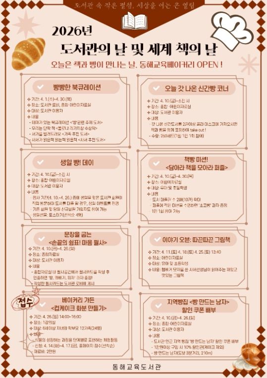 (포탈뉴스통신) 동해교육도서관은 4월 12일 도서관의 날과 4월 23일 세계 책의 날을 맞아 ‘오늘은 책과 빵이 만나는 날, 동해교육베이커리 오픈(OPEN)!’을 주제로 지역주민과 함께하는 독서문화 행사를 운영한다.
