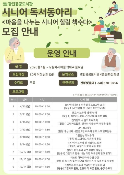 책과 독서에 관심 있는 관내 50세 이상 시니어라면 누구나 신청할 수 있으며 광천공공도서관누리집 프로그램 신청 또는 전화 접수로 신청하면 된다.