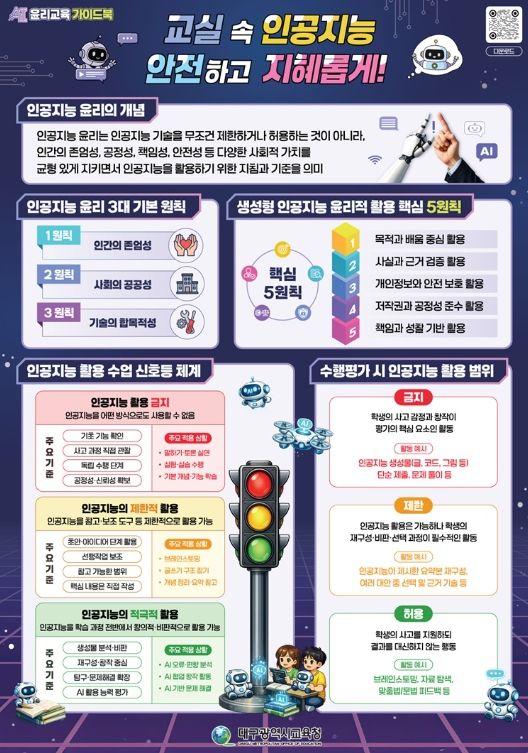 (포탈뉴스통신) 대구시교육청은 인공지능(AI) 기술이 일상과 교육 전반에 빠르게 확산되는 환경 속에서, 학생들이 기술을 올바르고 책임 있게 활용할 수 있도록 지원하기 위해‘AI 윤리교육 가이드북’과 ‘범교과 SW·AI 디지털 시민윤리 교수∙학습자료’를 개발해 학교 현장에 보급한다.