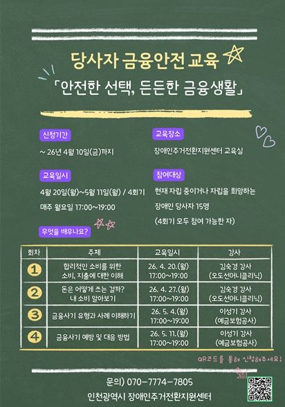 (포탈뉴스통신) 인천시사회서비스원 소속 인천시장애인주거전환지원센터는 당사자 금융 안전교육 ‘안전한 선택, 든든한 금융 생활’ 참가자를 모집한다고 6일 밝혔다.