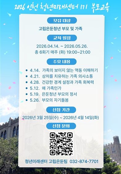 참여를 원하는 부모나 가족은 인천시청년미래센터로 전화 문의하거나 포스터 내 큐알 코드를 이용하면 신청할 수 있다.