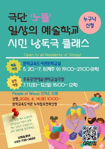 (포탈뉴스통신) 문막교육도서관은 5월 20일부터 7월 8일까지 매주 수요일 저녁, 지역 극단 ‘노뜰’의 전문 배우들과 협력해 시민들의 일상을 예술로 물들이는 특별한 예술학교를 운영한다.