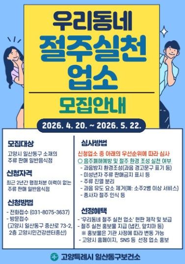 모집 기간은 오는 20일부터 5월 22일까지이며, 고양시 일산동구 소재 일반음식점 중 주류를 판매하는 업소를 대상으로 한다.