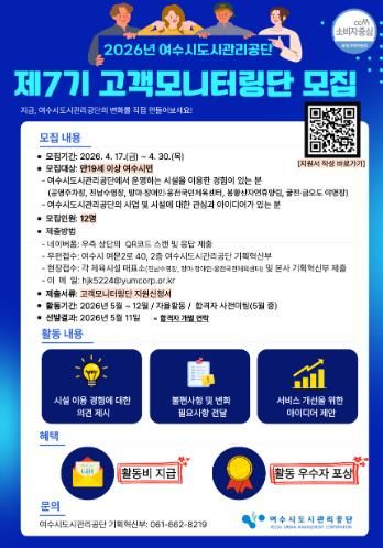 (포탈뉴스통신) 여수시도시관리공단은 시민 참여를 기반으로 공단 시설과 서비스 품질을 점검하고 개선하기 위한 '2026년 제7기 고객모니터링단'을 모집한다고 밝혔다.