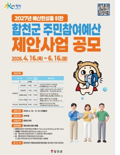 (포탈뉴스통신) 합천군은 2027년도 예산편성을 위한 주민참여예산 제안사업 공모를 6월 16일까지 실시하며, 올해부터 공모 분야를 기존 1개 모델 3개 유형에서 3개 모델 5개 유형으로 확대 개편한다고 밝혔다.