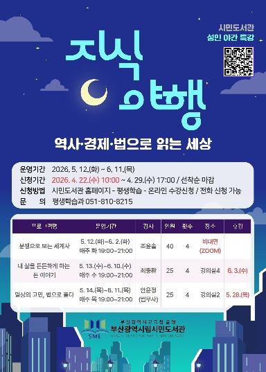 (포탈뉴스통신) 부산광역시립시민도서관은 오는 5월 12일부터 6월 11일까지 낮 시간 도서관 이용이 어려운 성인 90명을 대상으로 도서관 강의실과 온라인(ZOOM)을 통해 ‘지식 야행’특강을 운영한다.
