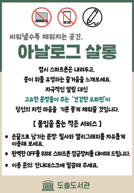 도서관은 이번 프로그램을 통해 깊이 읽고 생각하는 시간을 되찾는 ‘아날로그 쉼터’로서의 역할을 강화할 방침이다.