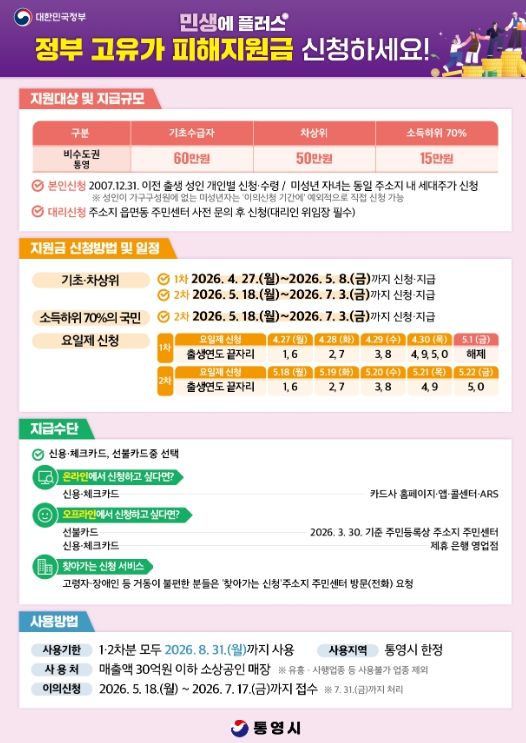 특히 두 지원금은 신청 시기가 4월 말과 5월 초에 집중됨에 따라, 시민들이 혼선 없이 혜택을 누릴 수 있도록 사업별 세부 내용을 안내하고 행정력을 집중할 방침이다.