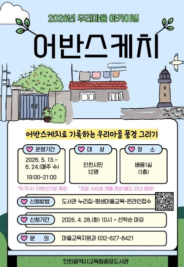 (포탈뉴스통신) 인천광역시교육청중앙도서관은 2026년도 마을교육 아카이빙 사업의 일환으로, 5월 13일부터 ‘우리 마을 아카이빙, 어반스케치’ 프로그램을 운영한다.