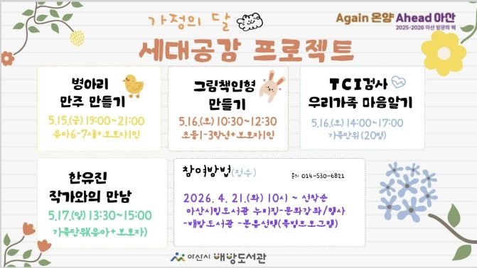 최경화 아산시립도서관장은 “가정의 달을 맞아 어린이와 가족들이 함께 즐길 수 있는 프로그램을 준비했다”며 “도서관이 단순히 책을 읽는 공간을 넘어 가족 간의 소통을 돕고 추억을 쌓을 수 있는 문화 공간으로 자리매김하길 기대한다”고 밝혔다.