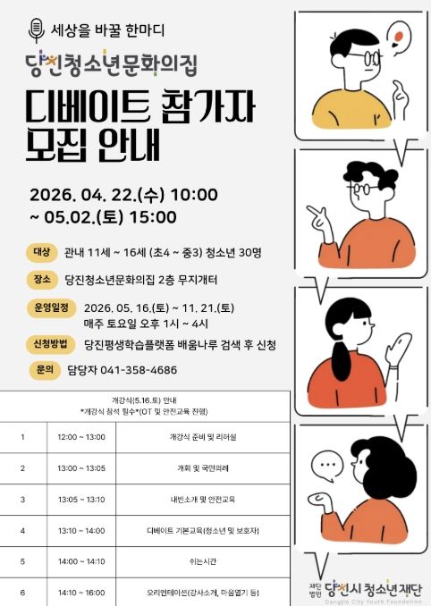(포탈뉴스통신) (재)당진시청소년재단 당진청소년문화의집에서는 5월 16일부터 11월 21일까지 매주 토요일마다 총 23회기에 걸쳐 관내 청소년(11세~16세) 30명을 대상으로 디베이트 프로그램이 진행될 예정이다.