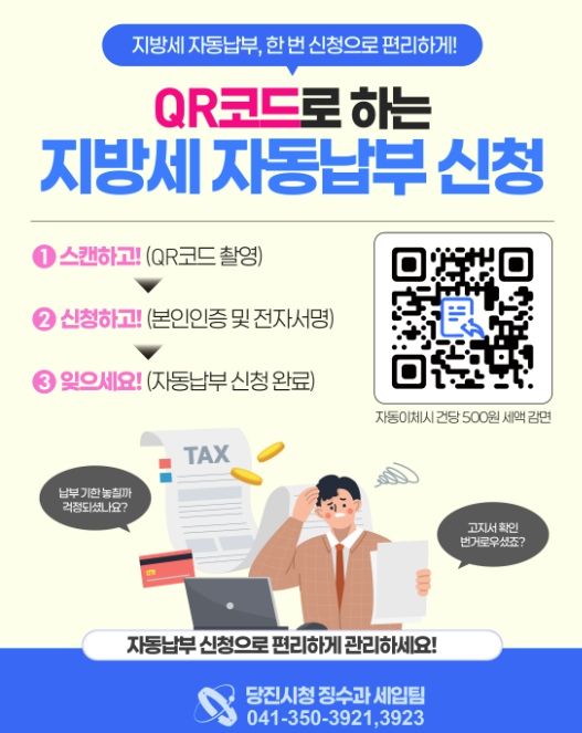 김영일 당진시청 징수과장은 “이번 서비스는 시민들이 느끼는 작은 불편을 해결하기 위해 고민한 결과”라며, “앞으로도 문턱 낮은 세무 행정과 시민 중심의 디지털 혁신을 지속적으로 추진해 나가겠다”라고 말했다.