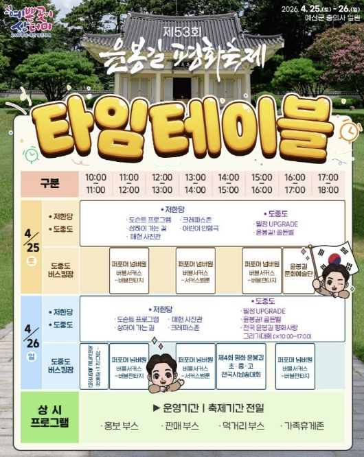 (포탈뉴스통신) 예산군은 ‘제53회 윤봉길 평화축제’를 오는 4월 25일부터 26일까지 덕산면 충의사 일원에서 개최한다고 밝혔다.