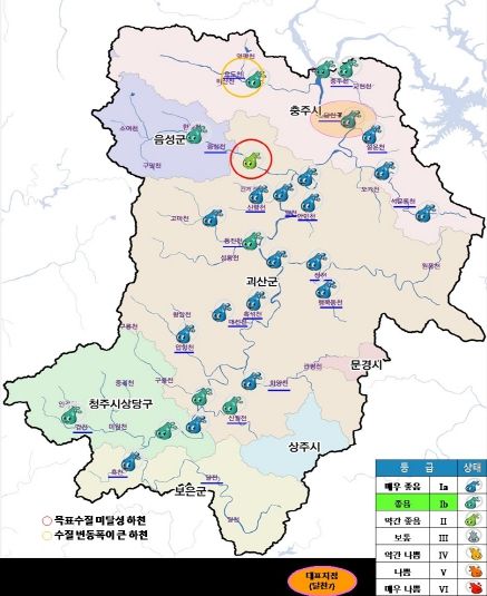 3대유역은 미호강, 대청호상류, 달천 유역으로 주요 지점 86개소에 대한 수질을 정기적으로 모니터링했으며, 3개유역 대표지점을 기준으로 수질을 평가했다.
