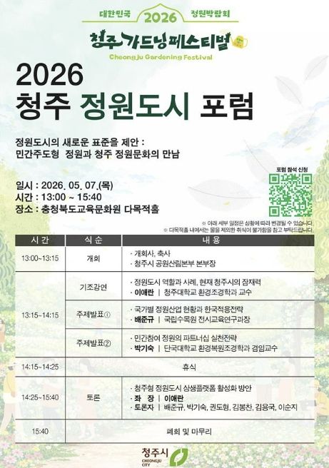 청주시는 오는 5월 7일 충청북도교육문화원 다목적홀에서 ‘2026 청주 정원도시 포럼’을 개최한다고 밝혔다.