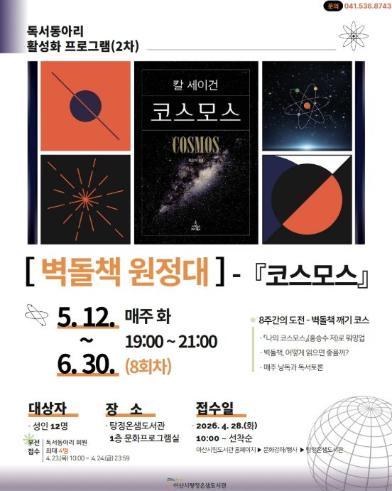 (포탈뉴스통신) 아산시 탕정온샘도서관이 오는 5월부터 ‘벽돌책 원정대 - 『코스모스』 함께 읽기’ 프로그램을 신규 운영한다.