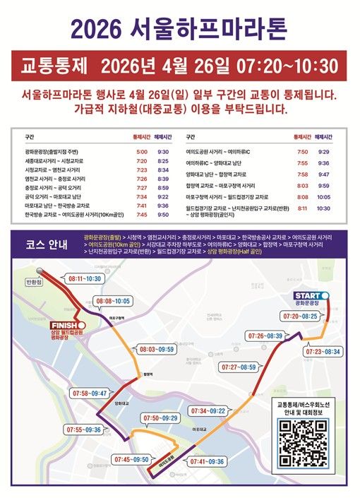 (포탈뉴스통신) 서울시는 4월 26일 오전 7시 30분 광화문광장을 출발해 여의도공원과 상암 월드컵공원으로 이어지는 ‘2026 서울하프마라톤대회’를 개최한다.