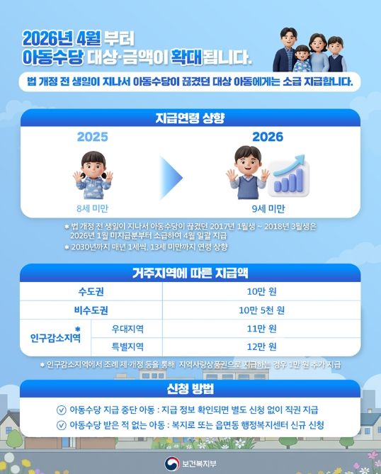 (포탈뉴스통신) 2026년 4월부터 아동수당 대상·금액이 확대됩니다.