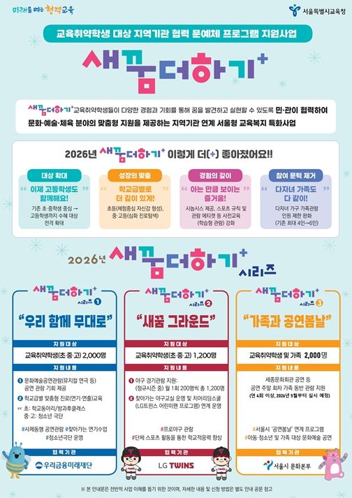 (포탈뉴스통신) 서울특별시교육청은 교육취약학생에게 문화·예술·체육 및 진로탐색 기회를 제공하는 민관협력 교육복지 사업 ‘새꿈더하기’를 2026년 더욱 확대 운영한다고 밝혔다.