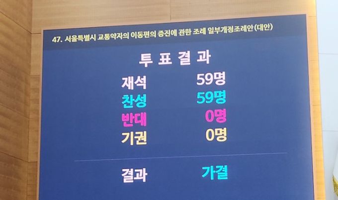 재석의원 59명의 만장일치로 가결된 이번 조례안은 향후 서울시의 공포 절차를 거쳐 본격적으로 시행될 예정이다.