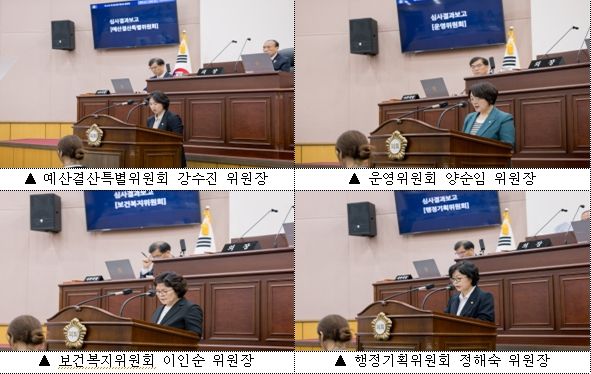 본회의에 앞서, 예산결산특별위원회 강수진 위원장, 운영위원회 양순임 위원장, 보건복지위원회 이인순 위원장, 행정기획위원회 정해숙 위원장이 위원회별 심사 결과를 보고했다.
