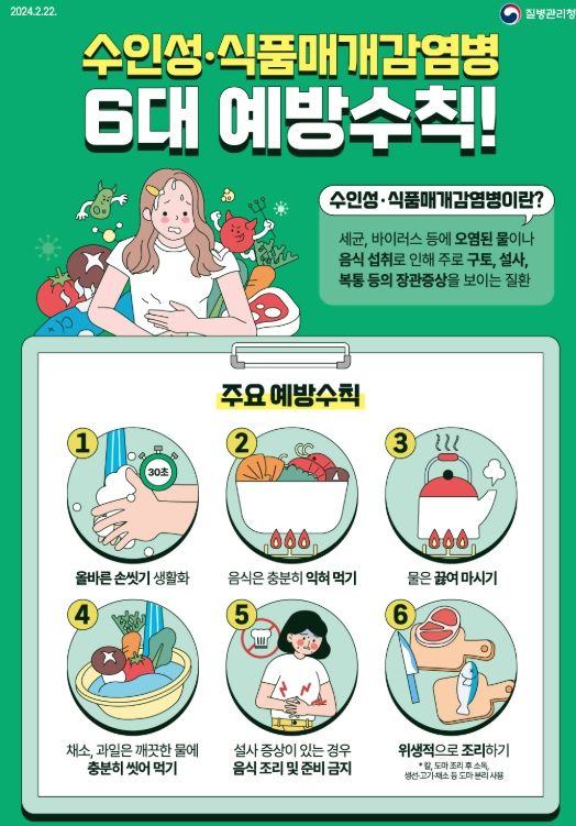 주요 예방수칙은 ▲흐르는 물에 30초 이상 비누로 손 씻기 ▲음식은 충분히 익혀 먹기(85℃ 이상에서 1분 이상 가열) ▲위생적으로 조리하기(칼·도마는 소독하여 사용, 생선·고기·채소별로 도마 분리 사용 등)▲채소, 과일은 깨끗한 물에 씻거나 껍질 벗겨 먹기 등이다.