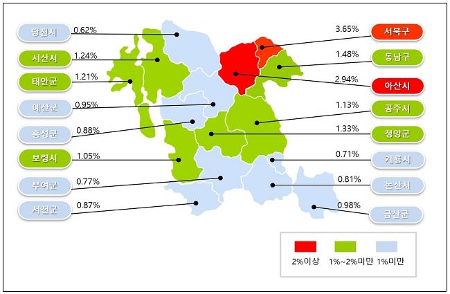 시군별 변동률은 천안시 서북구가 3.65%로 가장 높았고, 아산시가 2.94%로 뒤를 이었으며, 변동률이 가장 낮은 지역은 당진시 0.62%로 나타났다.