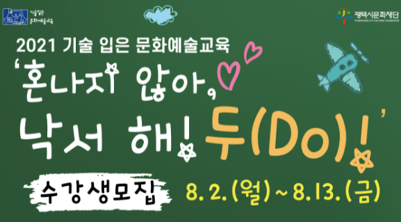 (포탈뉴스) 재단법인 평택시문화재단이 문화체육관광부가 주최하고 한국문화예술회관연합회와 (재)평택시문화재단이 주관하는 '2021 기술 입은 문화예술교육 ‘혼나지 않아, 낙서 해! 두(Do)!''수강생을 모집한다.