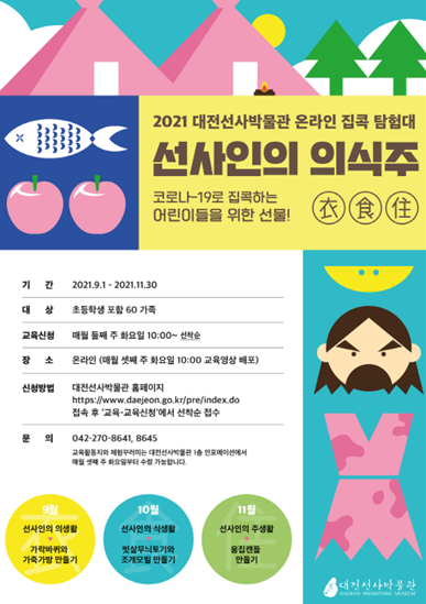 (포탈뉴스) 대전선사박물관은 9월부터 11월까지 초등학생 동반 가족을 대상으로 온라인 교육 프로그램 2021년 대전선사박물관 집콕탐험대 ‘선사인의 의식주(衣食住)’를 운영한다.