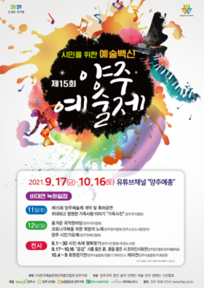 김영환 양주예총 지회장은 “올해로 15회째 맞는 양주예술제가 양주시의 문화예술 발전에 기여하고 코로나19로 어려움을 겪고 있는 시민들에게 작은 위로가 되길 바란다”고 전했다.