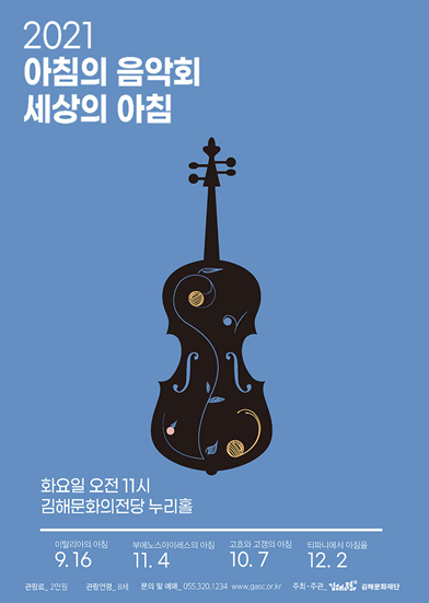 2021 하반기 새롭게 시작하는 '아침의 음악회'는 ‘이탈리아의 아침’(9월 16일), ‘고흐와 고갱의 아침’(10월 7일), ‘부에노스아이레스의 아침’(11월 4일), ‘티파니에서 아침을’(12월 2일) 이라는 제목으로 세계의 여러 나라의 도시와 음악, 알기 쉬운 해설을 통해 ‘코로나블루 탈출 세계여행’ 콘셉트로 진행된다.