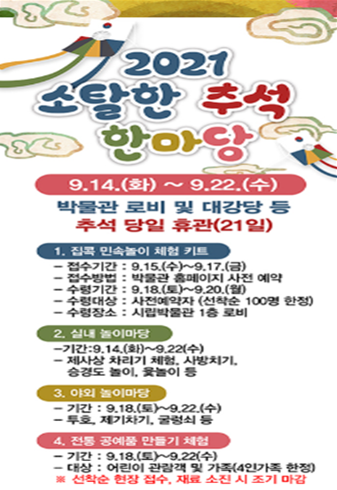 이번 행사는 추석을 맞아 박물관을 찾는 관람객들이 대면 및 비대면 전통문화 체험을 통해 우리나라 세시풍속을 이해하고, 코로나19로 여가생활 기회가 줄어든 시민들에게 문화생활 향유의 기회를 제공하기 위해 철저하게 방역수칙을 준수하며 진행된다.
