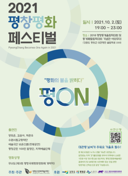 (포탈뉴스) 평창군과 (재)평창군문화예술재단은 10월 2일 평창군 대관령면 2018평창동계올림픽대회 및 동계패럴림픽대회 기념관 야외무대에서 “평ON, 평화의 불을 밝히다”라는 슬로건으로 2021 평창평화페스티벌을 개최한다.