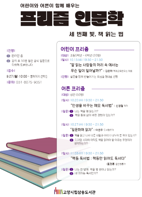 (포탈뉴스) 고양시 삼송도서관이 오는 10월부터 4주간 ‘독서법’을 톺아보는 특강 <프리즘 인문학, 세 번째 빛 : 책 읽는 법>을 개최한다.