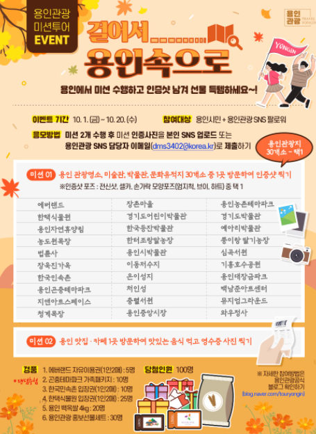 이번 미션투어 이벤트는 여행하기 좋은 계절인 가을철을 맞아 용인의 다양한 관광명소 30곳을 알리고, 가족과 친구 등 소규모 단위에 맞는 즐길거리를 제공해 코로나19로 위축된 관광 산업에 활력을 더하고자 마련됐다.