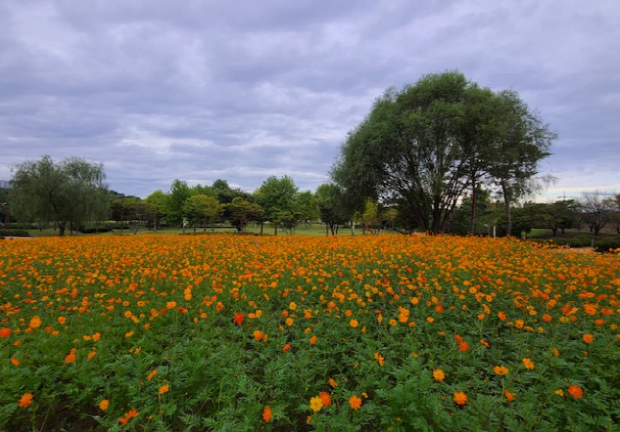 지난 8월 금은모래강변공원 야생초화원에 파종한 약 1만7천여본의 황학코스모스가 최근 만개하여 ‘인생샷’ 포토존으로 자리잡고 있어 공원을 찾는 시민들에게 특별하고 아름다운 추억을 선사하고 있다. 그리고 메리골드 약 2,500본도 만개해 시민들의 관람이 이어지고 있다.