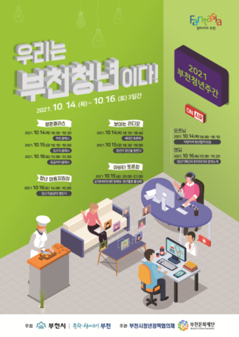 ‘2021 부천 청년주간’행사는 ‘우리는 부천청년이다’라는 슬로건 아래 각양각색의 청년들을 포용하고 청년들이 홀로 설 수 있는 프로그램으로 기획됐다.