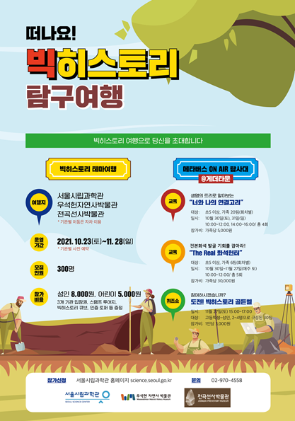 ‘과학탐구여행’은 서울시립과학관, 우석헌자연사박물관, 전곡선사박물관을 빅히스토리 코스로 엮어 각 기관에서 지구의 탄생부터 고생물 탐구, 인류의 탄생까지 빅히스토리를 엿볼 수 있도록 구성하였다. 투어에 참가하려면 서울시립과학관 홈페이지 및 서울시공공서비스예약을 통한 사전접수하면 된다. 사전예약자에겐 각 기관 입장권, 빅히스토리 큐브, 인증카드 등이 제공된다.